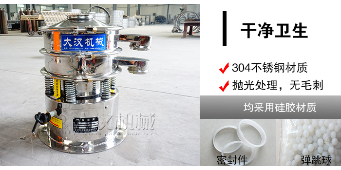 中西药颗粒属于医药行业,对于卫生要求十分严格,大汉旋振筛精选304不锈钢材质,密封件和弹跳球清网装置均采用硅胶材质,另外筛机内外经过抛光处理,无毛刺现象,符合医药卫生标准。