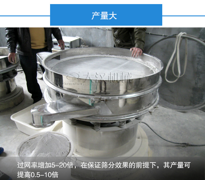 由于超声波筛分系统的设计,我们的设备比不安装超声波的振动筛过网率增加5-20倍,在保证筛分效果的前提下,其产量可提高0.5-10倍。