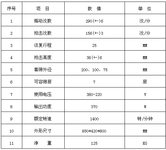 二、齿轮式拍击筛技术参数:本机符合国际标准要求(见表一)