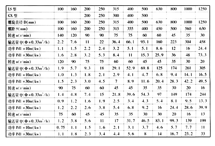 LS型、GX型螺旋输送机主要技术参数