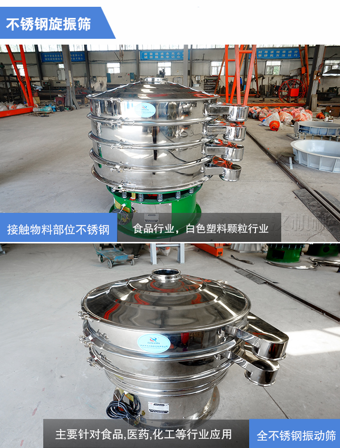 不锈钢旋振筛的材质样式分为接触物料部位为不锈钢和全不锈钢振动筛两种。接触物料为不锈钢材质的振动筛主要是物料对接触的设备材质有所要求,防止物料与碳钢接触对物料进行污染,特别是食品行业,白色塑料颗粒行业等。全不锈钢振动筛是主要针对食品,医药,化工等行业应用,其使用环境要求严格,容易对设备进行清理。