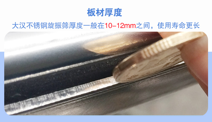 不锈钢旋振筛说的是整机或与物料接触部位为304不锈钢材质,有的厂家为了降低生产成本,将其板材厚度降低至4mm以下,虽然其价格会比较便宜,但是在后续使用过程中就会出现筛框断裂、寿命降低等问题,所以选择不锈钢旋振筛时请先查看板材厚度是否合格,大汉不锈钢旋振筛厚度一般在10-12mm之间,使用寿命更长。