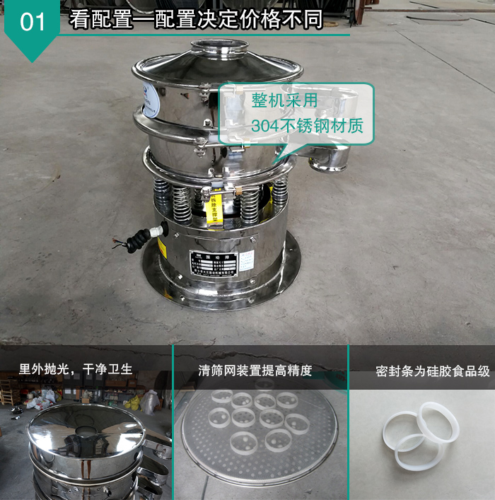 全不锈钢振动筛整机采用304不锈钢材质,里外抛光,干净卫生,无毛刺,无死角,密封条为硅胶食品,弹簧外围加304不锈钢裙边,同时还配备有专门的筛网清理装置,可将堵网率降到低,过网率和处理精度得以有效提高。 看型号—型号决定价格不同
