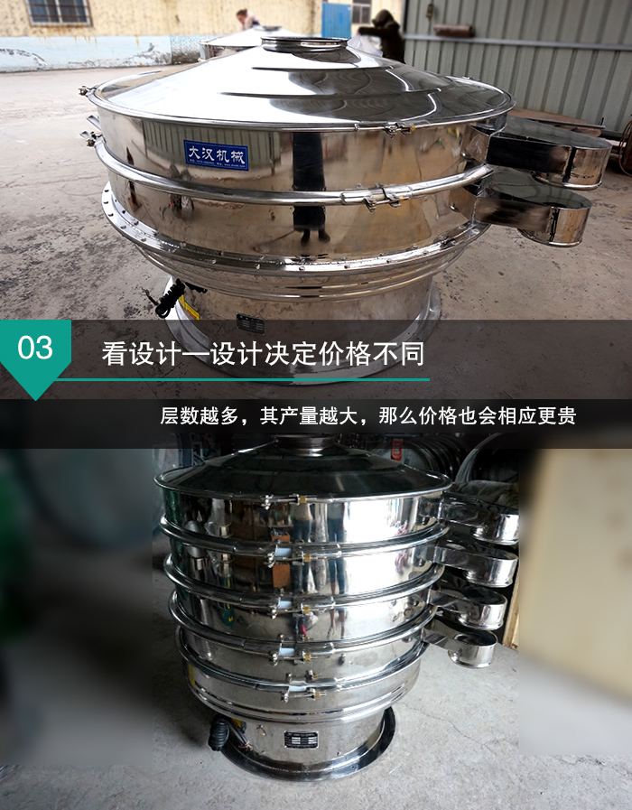 新乡大汉全不锈筛振动筛生产的直线振动筛型号从DH600到DH2000,不同型号的全不锈钢振动筛,其直径、筛网面积是不同的,所以这就决定了不同型号的全不锈钢振动筛产量是不同的,这也必然会造成全不锈钢振动筛价格上存在明显的差异。 看设计—设计决定价格不同